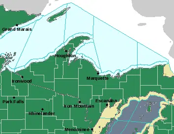 * Portions of central Upper Michigan and western Upper Michigan, bincluding the following areas, in central Upper Michigan, Alger, Baraga, Delta, Dickinson, Iron, Luce, Marquette, Menominee, Northern Schoolcraft, and Southern Schoolcraft. In western Upper Michigan, Gogebic, Keweenaw, Northern Houghton, Ontonagon, and Southern Houghton.