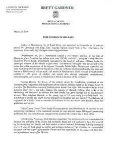 A 34-year-old Rapid River woman will spend between 38 months and ten years in prison for an auto accident that seriously injured a 19-year-old Gladstone woman. Prosecutor Brett Gardner says Audrey Jo Hutchinson was driving under the influence of alcohol and various drugs when she crashed into Hannah Delaire on December 19, 2017. Police say Hutchinson was going the wrong way on U-S 2 and 41at the time of the crash. Delaire has undergone numerous surgeries since the accident. Gardner called Hutchinson “selfish and indulgent” in asking for the maximum sentence. Read the prosecutor’s press release below.