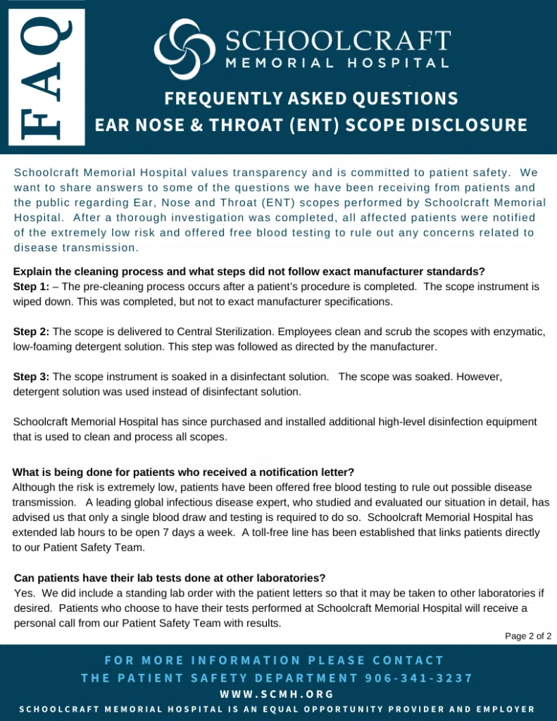 The CEO of Schoolcraft Memorial Hospital says that patients should have no worries about their safety after some patients were notified this month that the ENT scopes they received were not cleaned to exact manufacturer’s standards.