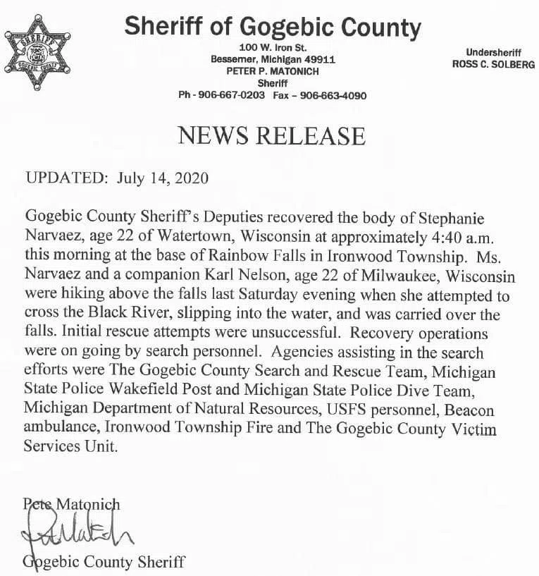 Gogebic County Sheriff’s deputies say they pulled the body of 22-year-old Stephanie Narvaez from the base of the falls at about 4:40 Tuesday morning. She had been hiking with her friend, 22-year-old Karl Nelson of Milwaukee, last Saturday night when she tried to cross the Black River. She slipped into the water and was carried over the falls.