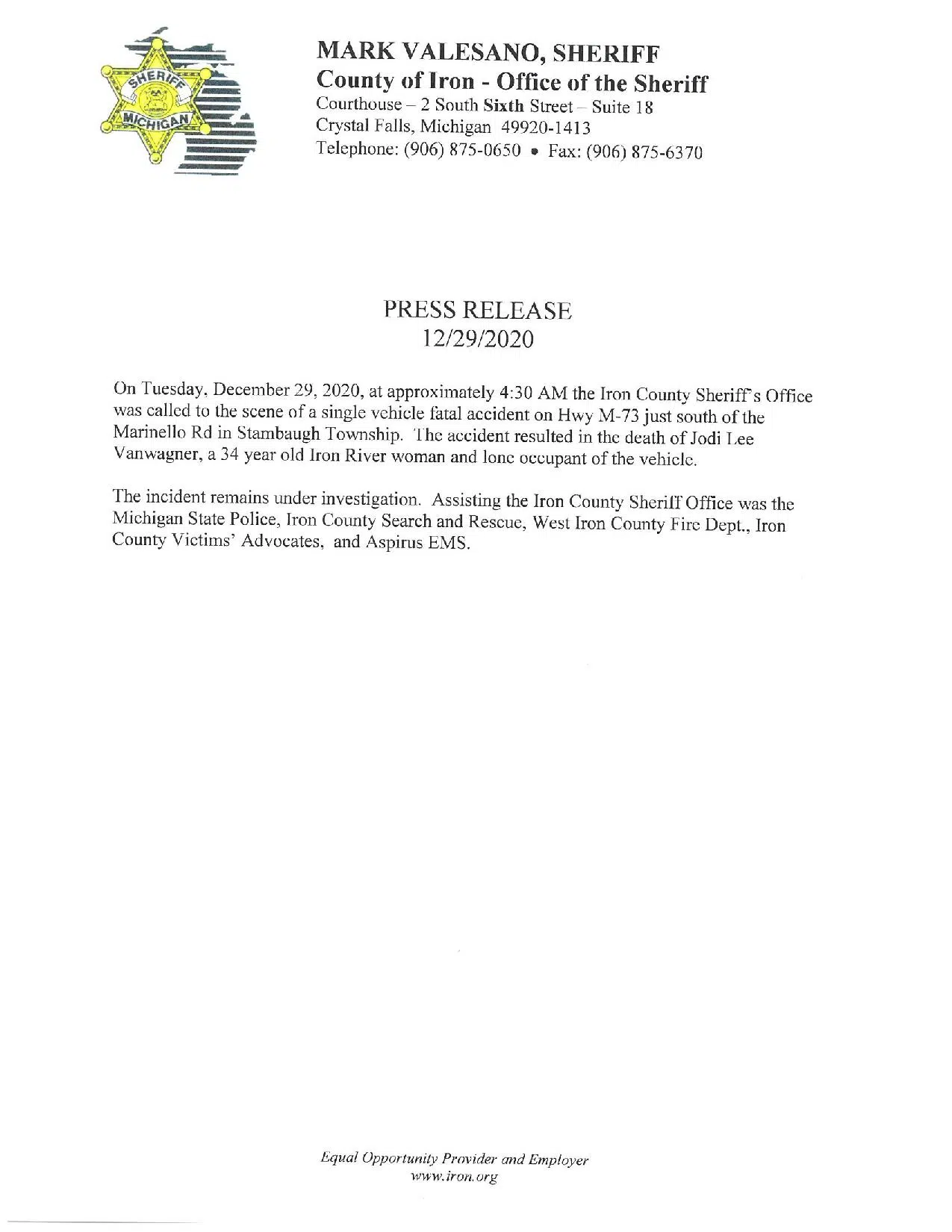 The Iron County Sheriff says it happened at about 4:30 Tuesday morning on M-73 in Stambaugh Township. Deputies say 34-year-old Jodi Lee VanWagner of Iron River died in the crash. She was the only person in the vehicle. The cause of that crash remains under investigation.