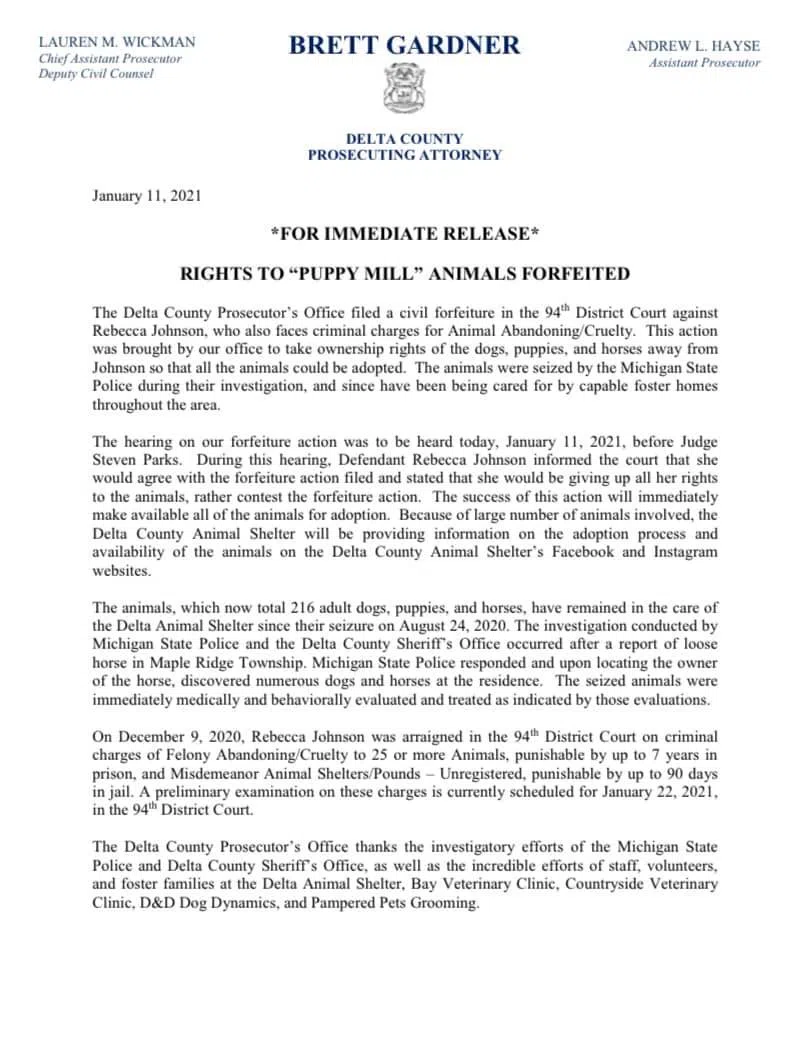 Delta County Prosecutor Brett Gardner says a hearing was scheduled Monday for Rebecca Johnson to answer to the civil forfeiture. That hearing was cancelled when Johnson signed off on her ownership rights for the animals. The Michigan State Police seized the dogs and horses from the property on August 24th. Gardner says that in all, there were 216 adult dogs, puppies, and horses seized and now the Delta Animal Shelter is in charge of finding homes for the animals.