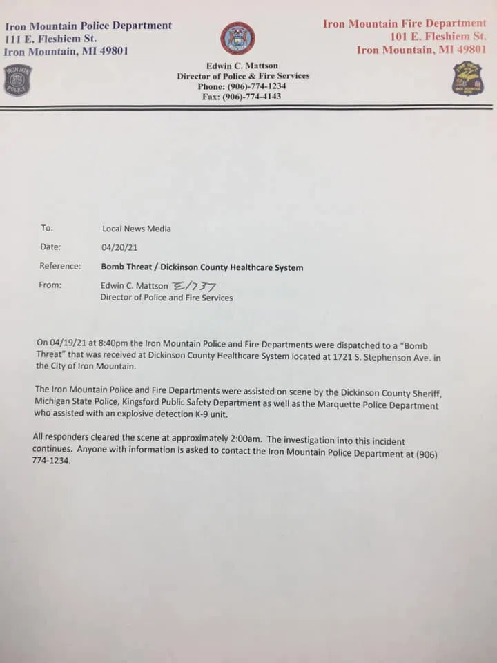 A bomb threat at the Dickinson County Healthcare System in Iron Mountain Monday night. Iron Mountain Police say they were called at 8:40 at night to come to the facility on Stephenson Avenue, along with the Michigan State Police and the Dickinson County Sheriff’s Department.