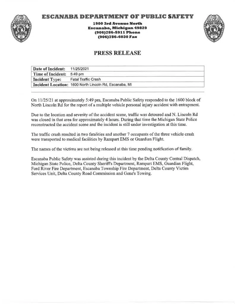 Two people are dead and seven people hospitalized following a traffic crash that shut down Escanaba’s busy North Lincoln Road (US-2-41) for some four hours on Thanksgiving Night.