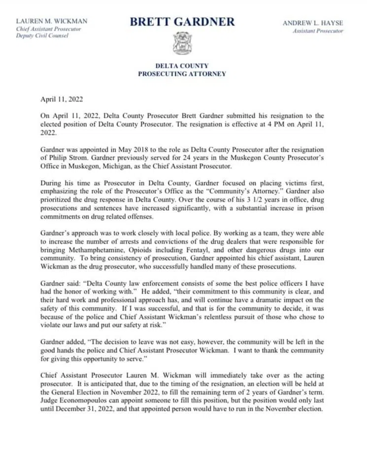 He made the announcement in a press release, and said that the resignation was effective as of 4:00 Monday. The press release was posted Monday night. He’s been the prosecutor since May of 2018, after Phil Strom resigned. Gardner did not give a reason for the sudden resignation.