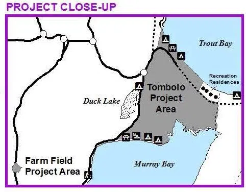 The Grand Island Habitat Restoration Project proposes to treat approximately 310 acres with methods including prescribed burning, mowing, mechanical thinning with chainsaws and brush saws, and felling snags. These proposed activities would occur in the historic Farm Field (approximately 2 acres) and the Tombolo area (between Murray and Trout Bays).