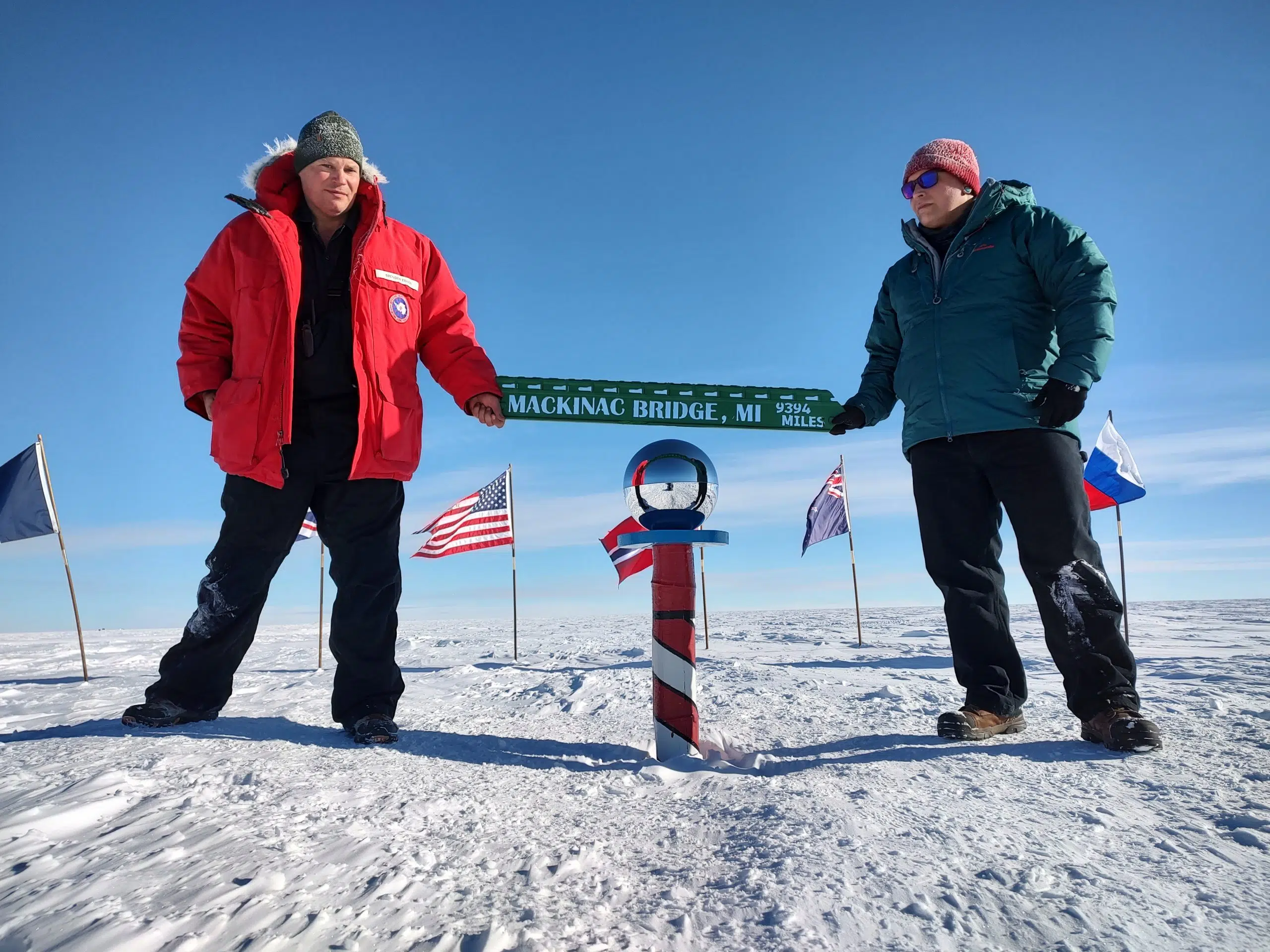 Brendan Fisher, Troy Leighton in Antarctica – Hans Suedhoff photo.jpg – Brendan Fisher, left, and Troy Leighton pose at the South Pole with a sign Fisher made with steel from the Macinac Bridge deck grating, listing the distance to the Mackinac Bridge from Antarctica.