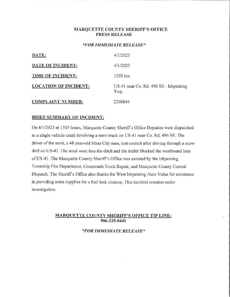 Marquette County Sheriffs Deputies say it happened at just after 1:00 in the afternoon on US-41 near County Road 496 when the 48-year-old driver from Mass City hit a snow drift in the highway and lost control of the semi. The semi went into the ditch, and the trailer blocked the westbound lane of the highway.