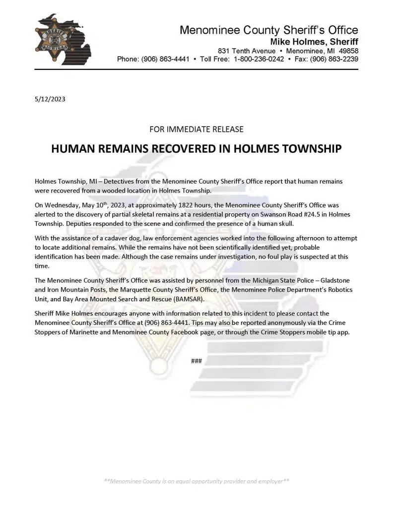 The skull was found last Wednesday on private property along Swanson Road in Holmes Township. The remains still need to be scientifically identified, and the investigation is on-going with help from the Michigan State Police, Marquette County Sheriff’s Department, and Menominee City Police.