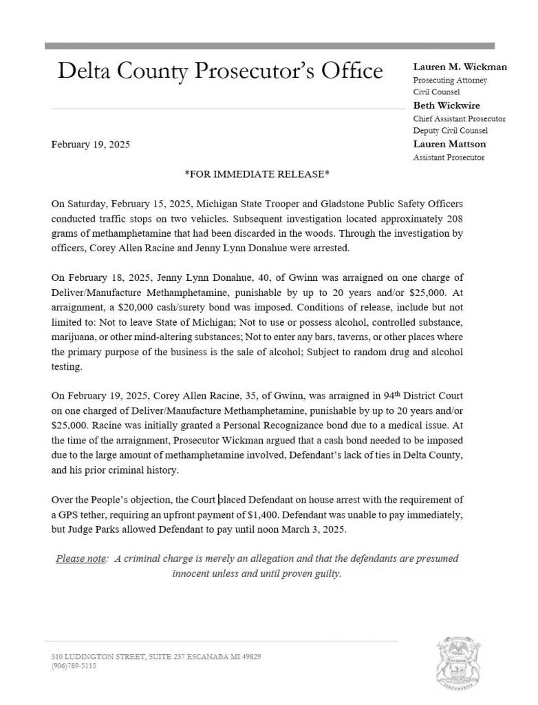 Gwinn Man Arrested On Meth Charges In Gladstone; Released With No Bond