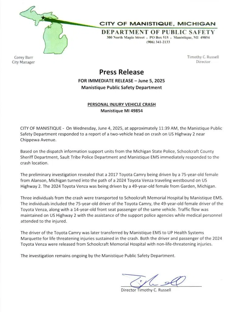 Manistique Public Safety says it happened at just before noon on US-2 near Chippewa Avenue. That’s on the city’s west side.