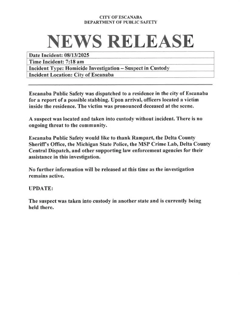 One person was found stabbed to death Wednesday morning at a home in Escanaba. Details are sketchy, but police say a suspect is in custody in another state. No further informtion yet being released, but Escanaba Public Safety says there is no ongoing threat to the cmmunity.