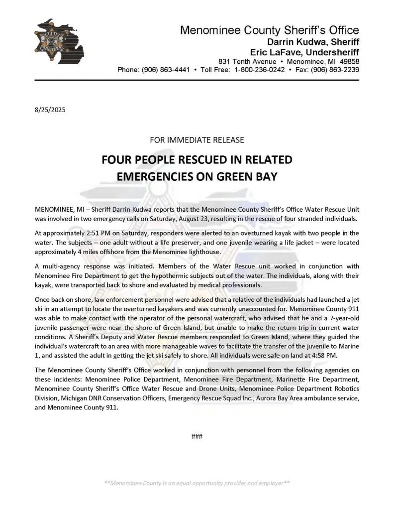 Four People Rescued In Menominee County Water Emergencies