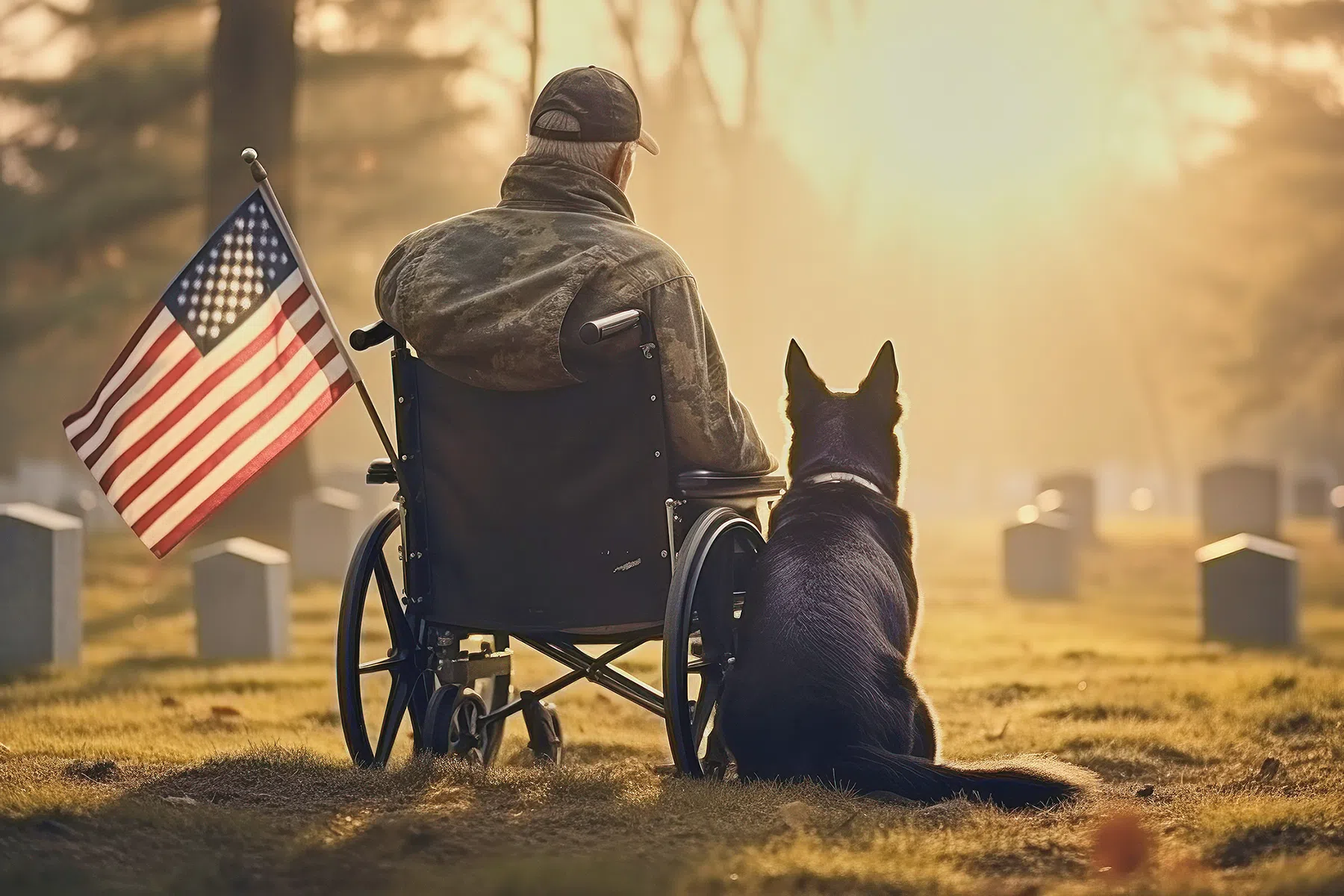 American war veteran in a wheelchair with with German Shepherd in a cemetery at Day of Remembrance