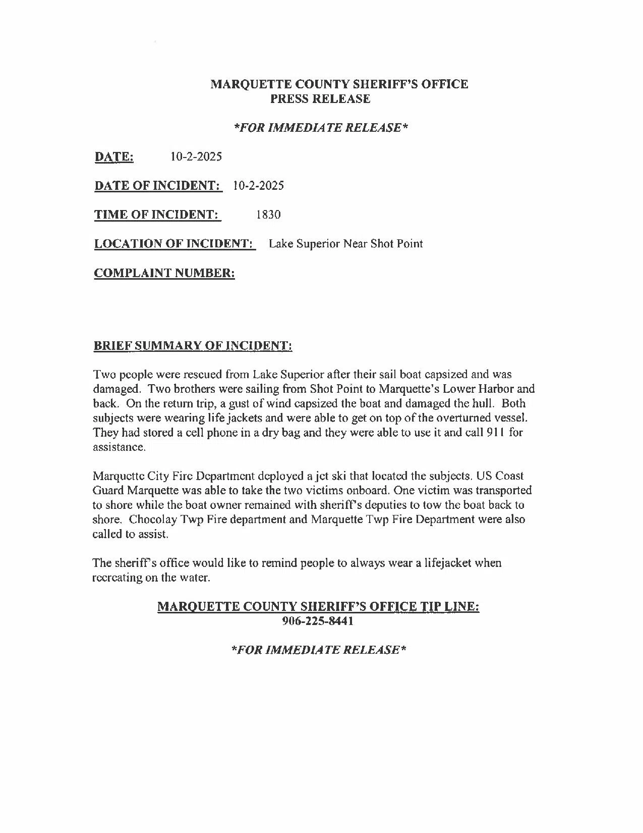 The Marquette County Sheriff says the pair was enroute from Shot Point to Marquette’s Lower Harbor.