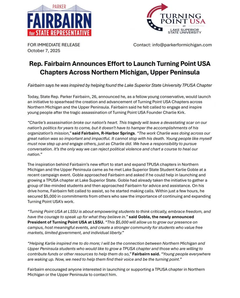 State Representative Parker Fairburn has announced a campaign to launch Turning Point U-S-A chapters across northern lower Michigan and the U-P.