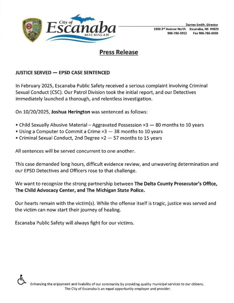 A 39-year-old Escanaba man will spend up to 15 years in prison for sex crimes involving children, according to Escanaba Public Safety.
