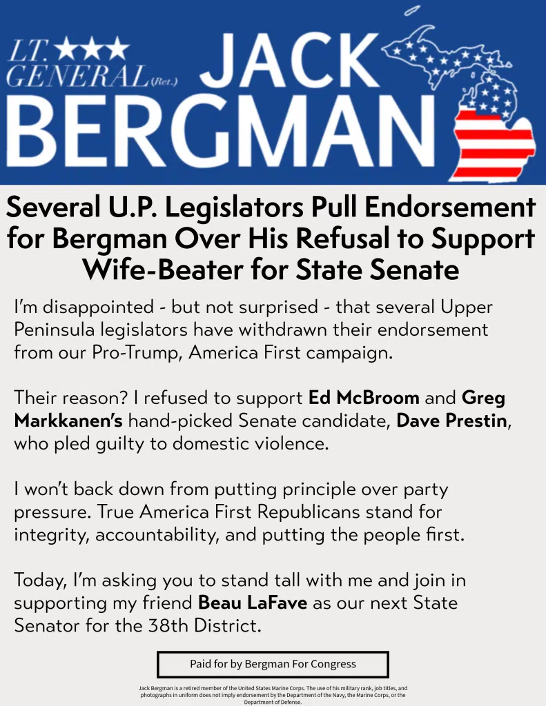 The following is a statement from Congressman Jack Bergman in response to the Upper Peninsula’s Republican state lawmakers rescinding their endorsement of Bergman in the upcoming election:
