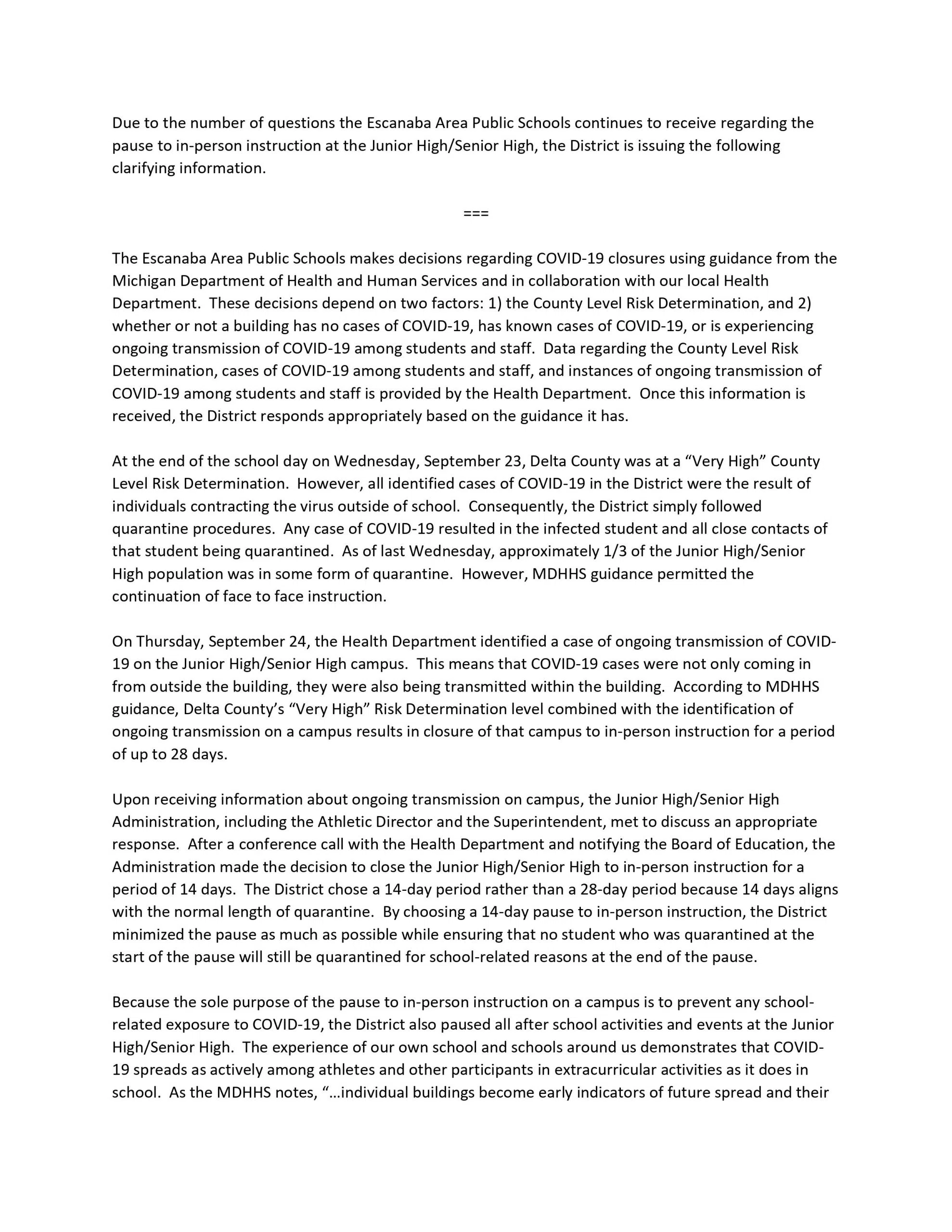 Escanaba School Superintendent Coby Fletcher issued a press release on Tuesday to answer questions raised by parents and others about his decision to close the high school and junior high to in-person instruction last Thursday.