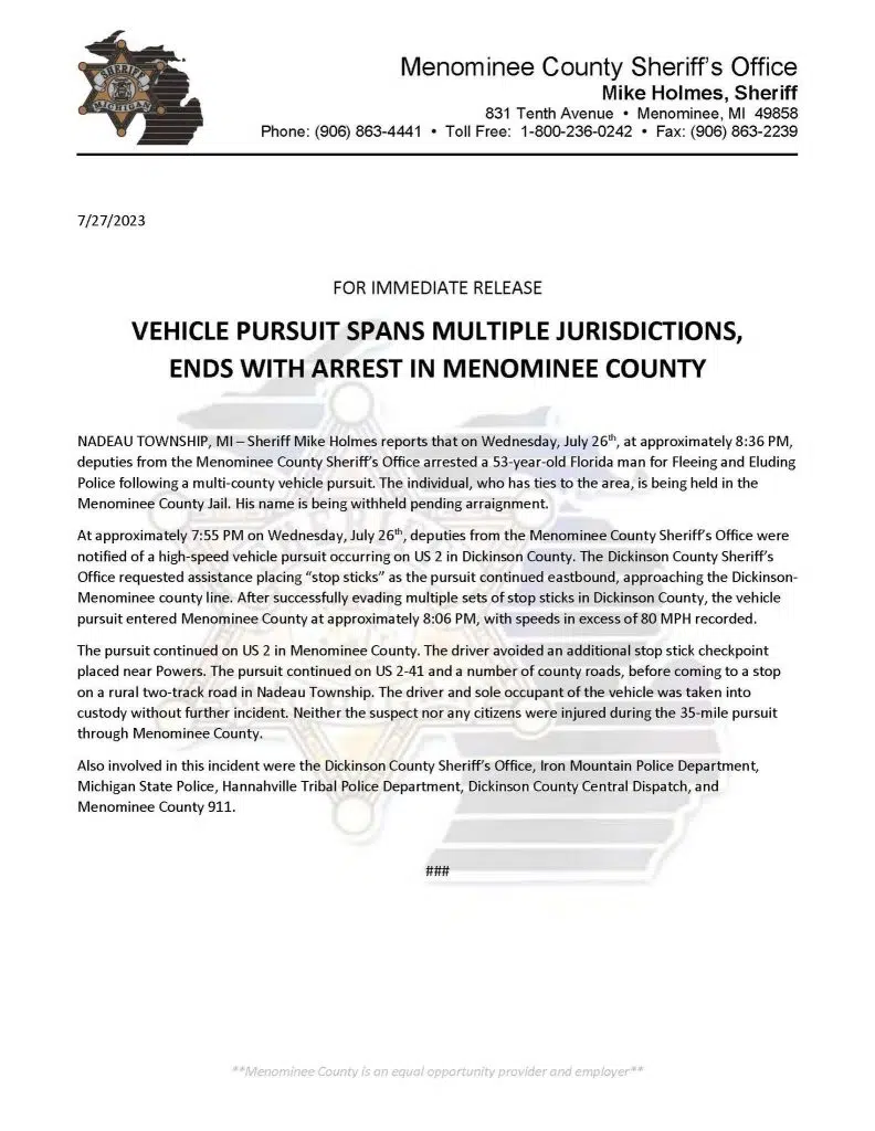 Florida Man Arrested After High Speed Chase Through Southern U.P.