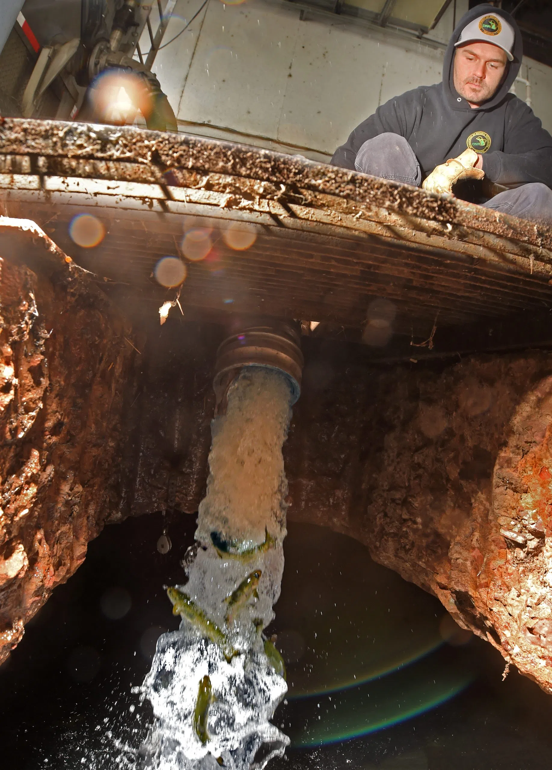 Lake Superior State University fisheries and wildlife management alumnus and Michigan Department of Natural Resources fisheries technician Dan Operhall empties about 20,000 Atlantic salmon fingerlings...