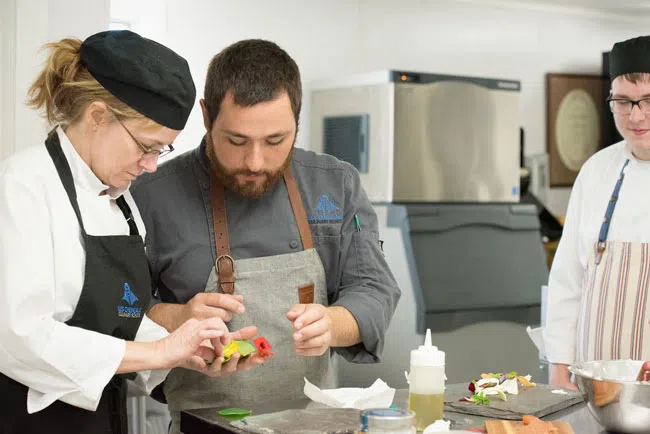 Lake Superior State University President Rodney Hanley and Jim Krzeminski, President of the Les Cheneaux Culinary School Board of Director, are signing an agreement to deliver a culinary arts certific...