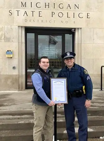 Rep. Beau LaFave visited the Iron Mountain State Police Department Saturday to take part in a ride-a-long, presenting them with a legislative tribute. Sgt. Doug Cole accepted the tribute in recognitio...