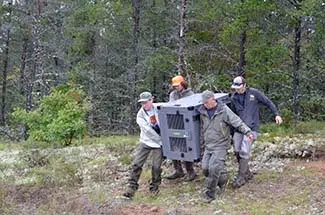Jack Hall Dec 27, 2019 From left, Michigan Department of Natural Resources veterinary specialist Dan O’Brien, Todd Kautz, Michigan DNR wildlife technician Brad Johnsono and Nick Fowler transport a captured gray wolf to a waiting van Sept. 6, 2019 in Michigan’s Upper Peninsula. Kautz and Fowler are both graduate research assistants with the State University of New York’s College of Environmental Science and Forestry.
