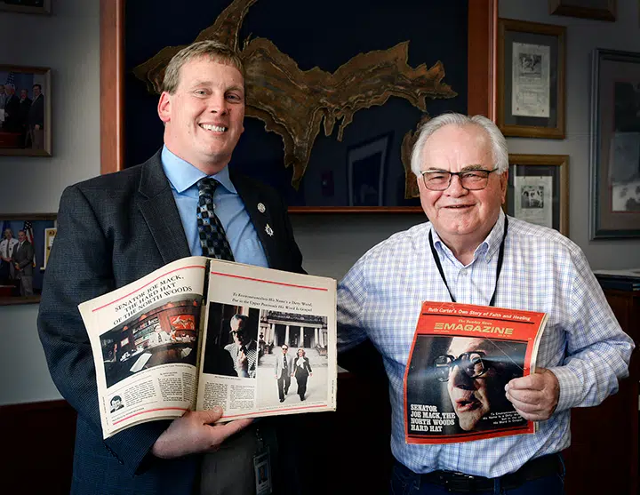State Sen. Ed McBroom, R-Vulcan, recently welcomed to his Lansing office Gary Mack, who is the son of former state Sen. Joe Mack, D-Ironwood. McBroom and Mack are pictured before a sculpture that was ...